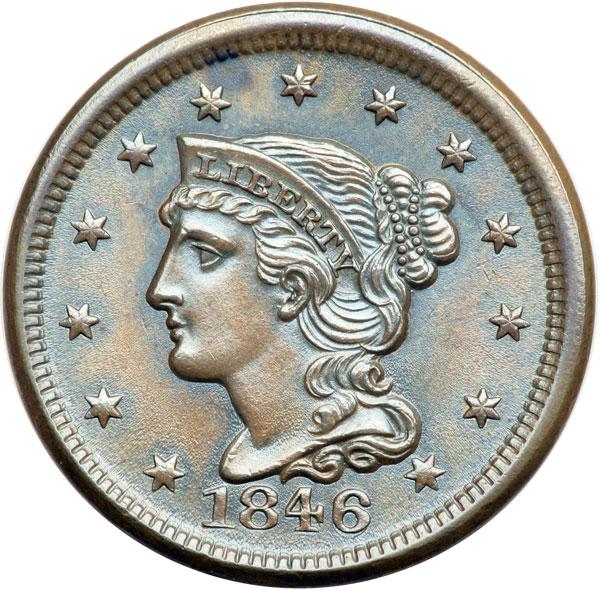 1846 N-6 R1 Repunched 46 MS63+. Very attractive bluish steel brown with satiny, highly lustrous surfaces. Flawless except for a very tiny tick in the field off the upper lip and a spot of darker olive brown toning over star 6. Sharply struck