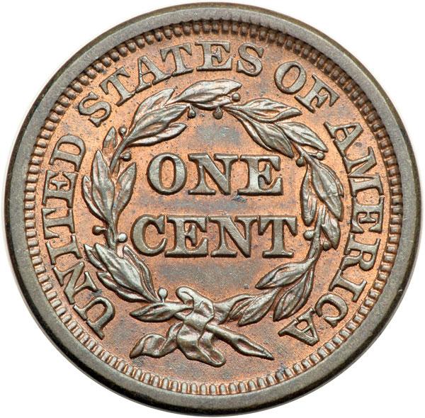 1846 N-7 R2+ MS63. Glossy bluish steel brown with a third of the red remaining, although it has faded down a bit from its original brilliance. The only marks are a small spot of dark toning on star 11 and a light nick in the dentils at star 13.