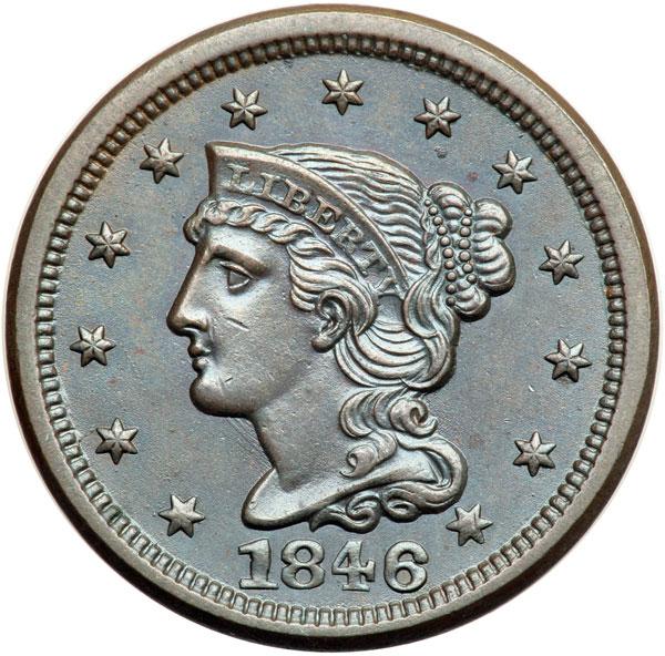 1846 N-8 R1 MS60+. Glossy bluish steel brown with attractive satiny mint luster. There are two light nicks just right of the nostril and a couple specks of dark toning under star 8. Otherwise this cent is choice. Nicely struck