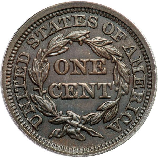 1846 N-26 R5 Tall Date Repunched 1. PCGS graded MS-63 Brown. Glossy uniform chocolate and olive brown. Smooth and quite attractive, virtually flawless to the unaided eye. The color may not be original, but it affords great eye appeal. The best identifying mark is a faint spot of slightly darker toning in the field midway between star 1 and the chin.