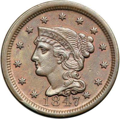 1847 N-7 R2+ VF35. Five points sharper but lightly cleaned and retoned steel brown and chocolate with steel toning on the highpoints and very faded artificial red remaining in protected areas. There are a few tiny ticks scattered about both sides, none notable, and a splash of dark olive toning on the rim over the E in AMERICA.