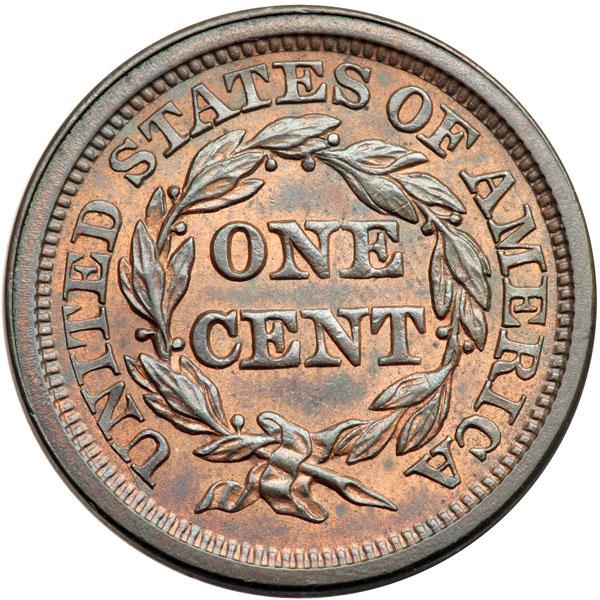 1847 N-35 R3+ MS63. Lustrous bluish steel brown with 30% of the mint red remaining, mostly on the reverse. No spots or contact marks, but there are some tiny flakes out of the planchet at the dentils right of star 11, as struck. The hair over the ear is not quite fully struck, as usual on this variety. The remainder of the design is sharp.