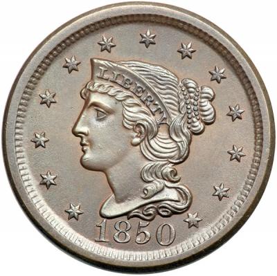 1850 N-4 R1 MS62. Lustrous bluish steel brown, a lighter shade of brown inside the wreath, with hints of very faded underlying mint red on the obverse. Covered with attractive satiny mint frost. There is a speck of carbon on the bottom of the front edge of the eyeball and another on the temple, plus a light tick on the chin and one on the coronet over the L. Sharply struck