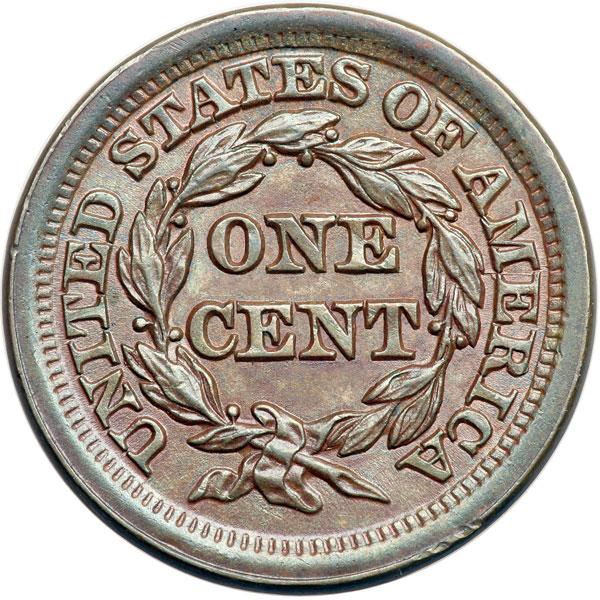1851 N-4 R1 Repunched 1's MS60. Frosty bluish steel brown with hints of very faded mint red on the reverse. The fields are covered with attractive satiny mint luster, especially the obverse. There is a tiny rim nick at E in UNITED and a few more off the stem tip.