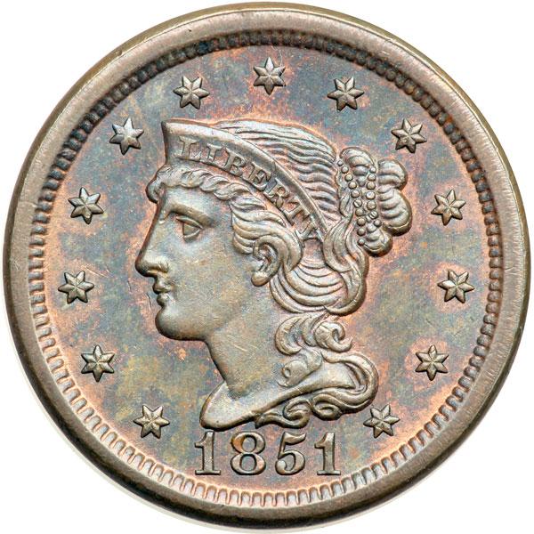 1851 N-9 R3- MS62. Glossy bluish steel brown with 15% of the red remaining on the obverse, 40% on the reverse. There are two small, vertical struck-through lines in the field before the lips and a small nick on the coronet over the E.