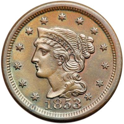 1853/3 N-4 R3+ Boldly Repunched 3 AU50. Sharpness mint state but dipped, now retoned frosty light bluish steel brown with faded red in protected areas. The only mark is a small spot of very fine roughness in the dentils under star 1.