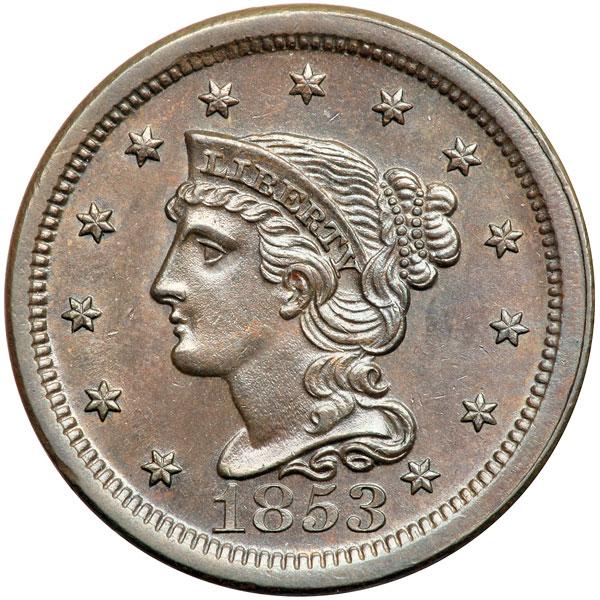 1853 N-5 R2- MS60. The obverse is glossy steel brown and chocolate while the reverse is lustrous bluish steel brown with faded mint red in protected areas. There is a dull, barely visible rim nick under star 2 and a short, faint diagonal hairline scratch under NT in CENT. The dentils at star 6 are a bit weak but everything else is sharply struck.