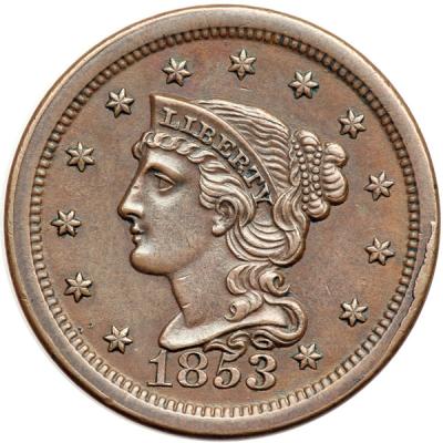 1853 N-14 R2+ Repunched 1 EF45+. Glossy medium brown and chocolate. Two tiny nicks on the front edge of the neck. Sharply struck