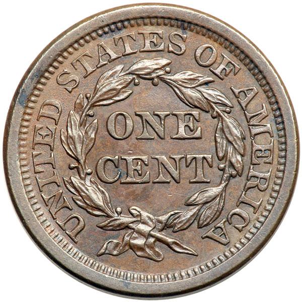 1853 N-15 R2 Repunched 5 MS60. Frosty medium brown with traces of faded mint color in protected areas of the obverse. The only defects visible without a strong glass are a few small splashes of darker olive brown toning in the dentils over AT and the second S in STATES plus a couple more on the rim at D-S and under the wreath ribbon. A strong glass reveals some very faint pinscratches inside the O in ONE and C in CENT. Rare