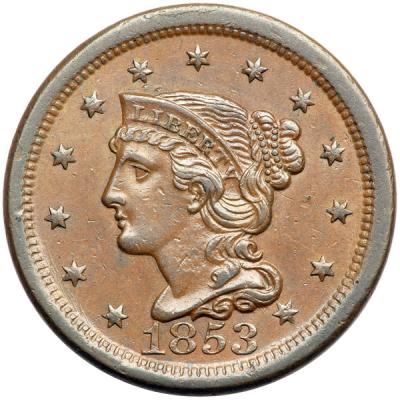 1853 N-21 R3+ EF45. Glossy medium brown with frosty lighter brown covering the protected areas and steel brown on the highpoints. A light nick on the rim at star 3 and a short struck-through line in the middle of the neck (as struck) are the notable marks. Rare