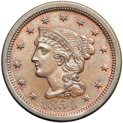 1854 N-18 R3 MS62. Lustrous light to medium brown with steel brown toning on the highpoints and 5% of the mint red remaining on the obverse, 20% on the reverse. There are two tiny specks of darker toning right of star 9 and a small diagonal nick on the bust tip.