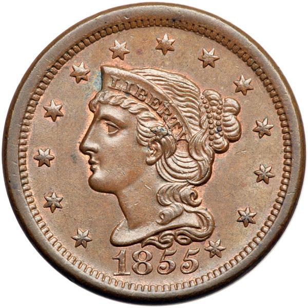 1855 N-9 R1 Italic 55 Knob on Ear AU55. Mint state sharpness but there is a carbon spot in the wreath under the second S in STATES, a dull rim nick at N in UNITED, a smaller rim nick off the stem tip, and another under the ribbon loop. Otherwise this cent is very nice. Frosty light steel brown with traces of mint red in protected areas.
