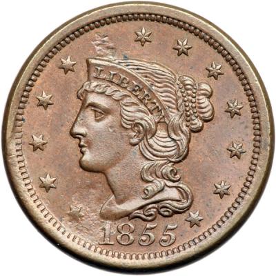 1855 N-10 R1 Italic 55 11.5-Star Die State MS60. Lustrous light steel brown with underlying faded mint color showing through in the field and protected areas. A tiny spot of dark toning at the hairline left of star 7 and a very small planchet depression high on the cheekbone are the notable marks.