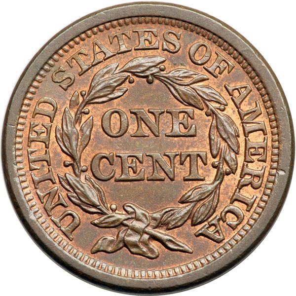 1856 N-19 R2 Italic 5 Repunched 856 MS63. Lustrous bluish steel brown with15% of the red remaining on the obverse, 25% on the reverse. No spots or stains. The best identifying marks are a tiny nick on the jawline at the throat, a tiny planchet flake on the rim at star 6, and another on the rim over the left side of the R in AMERICA.