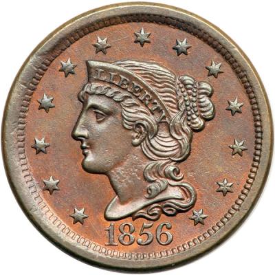 1856 N-22 R6- Italic 5 MS60. Frosty steel brown with underlying faded red covering the protected areas. Possibly lightly cleaned and retoned. There is a thin arc of darker steel toning through TED-STATES-OF-A. The contact mark is a short, light scratch well hidden in the hair under ER in LIBERTY.
