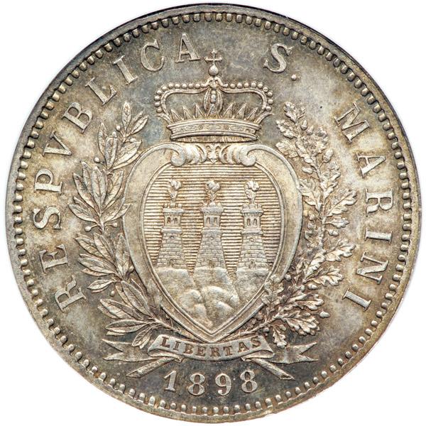Lot 4905 of 4978: San Marino. 5 Lire, 1898-R. NGC MS62