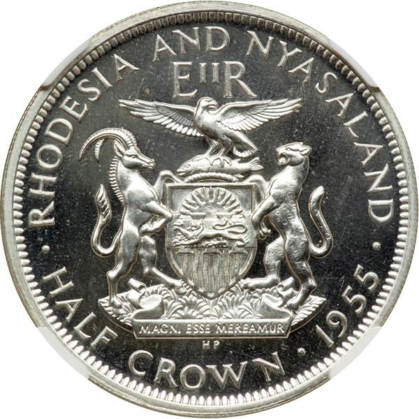 catalog Auction info Buyers Premium of 20.00% added to each and every lot The Pre-Long Beach Auction(#62) 01/30/2011 12:00 PM PST CLOSED! Lot 4891 of 4978: Rhodesia & Nyasaland. ½ Crown, 1955. NGC PF66 Click image to enlarge PreviousNextSimilar Items Lot closed - Winning bid:$850 (1 bid) Estimate: $500 - $600 Remove from watchlist Add to watchlist Tell a friendAsk a question The Pre-Long Beach Auction(#62) 01/30/2011 12:00 PM PST CLOSED! Description Description: Rhodesia & Nyasaland. ½ Crown, 1955. KM-7. Mintage of only 10 in proof. Elizabeth II bust right. Reverse: Arms and supporters. Choice and rare. NGC graded Proof 66 Cameo. Estimated Value $500 - 600. Categories: World Crowns & Minors