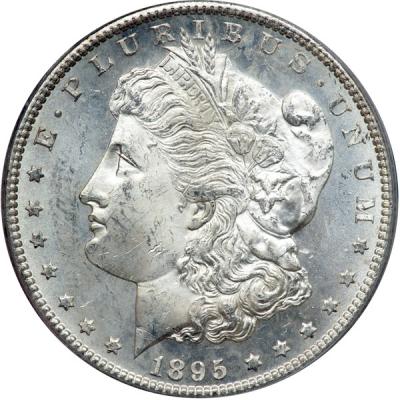 1895-S. PCGS graded MS-64. Well struck and mostly white. Scarcer date and always in demand. Odd as it may seem, many of the few choice-quality 1895-S Morgans extant display a semi reflective to Prooflike finish. Of course, Gem Silver Dollars of this issue are exceedingly expensive, and rare in an absolute sense. The present MS64 example easily qualifying as among the more attractive from this year and mint. From an original production of just 400,000 pieces comes this gleaming, captivating piece whose surfaces include satiny devices. Boldly, if not quite razor-sharp over all elements of the design, the coin seems to have attracted fewer than normal blemishes and bagmarks, which improves its report card. A coin that would be difficult to improve upon in terms of eye appeal and technical choiceness in a survivor of this avowedly difficult S-mint date.