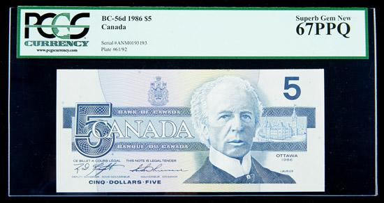 catalog Auction info Buyers Premium of 20.00% added to each and every lot The Pre-Long Beach Auction(#62) 01/30/2011 12:00 PM PST CLOSED! Lot 4384 of 4978: BC-56d 1986 $5. Superb Gem New 67PPQ Click image to enlarge PreviousNextSimilar Items Lot closed - Winning bid:$40 (2 bids) Estimate: $75 - $100 Remove from watchlist Add to watchlist Tell a friendAsk a question The Pre-Long Beach Auction(#62) 01/30/2011 12:00 PM PST CLOSED! Description Description: Canada, BC-56d 1986 $5. Superb Gem New 67PPQ. The second of two consecutive, this with a "repeater" serial number ANM0193193. Estimated Value $75 - 100. Categories: World Crowns and Minors