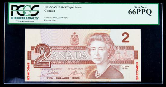 catalog Auction info Buyers Premium of 20.00% added to each and every lot The Pre-Long Beach Auction(#62) 01/30/2011 12:00 PM PST CLOSED! Lot 4375 of 4978: BC-55aS 1986 $2. Specimen. PCGS Gem New 66PPQ Click image to enlarge PreviousNextSimilar Items Lot closed - Winning bid:$320 (28 bids) Estimate: $75 - $100 Remove from watchlist Add to watchlist Tell a friendAsk a question The Pre-Long Beach Auction(#62) 01/30/2011 12:00 PM PST CLOSED! Description Description: Canada, BC-55aS 1986 $2. Specimen. PCGS Gem New 66PPQ. From the November, 2000 Bank of Canada sale. Estimated Value $75 - 100. Categories: World Crowns and Minors