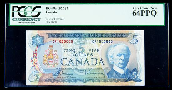 catalog Auction info Buyers Premium of 20.00% added to each and every lot The Pre-Long Beach Auction(#62) 01/30/2011 12:00 PM PST CLOSED! Lot 4345 of 4978: BC-48a 1972 $5. PCGS Very Choice New 64PPQ Click image to enlarge PreviousNextSimilar Items Lot closed - Winning bid:$400 (15 bids) Estimate: $250 - $300 Remove from watchlist Add to watchlist Tell a friendAsk a question The Pre-Long Beach Auction(#62) 01/30/2011 12:00 PM PST CLOSED! Description Description: Canada, BC-48a 1972 $5. PCGS Very Choice New 64PPQ. Serial number CP1000000. Estimated Value $250 - 300. Categories: World Crowns and Minors