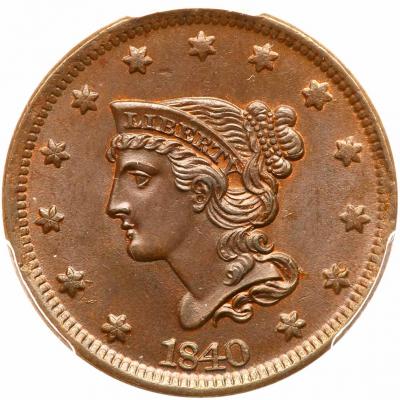 Lot 8 of 2145: 1840 N-5 R1 Large Date with Repunched 0 PCGS graded MS64+ Brown, CAC Approved