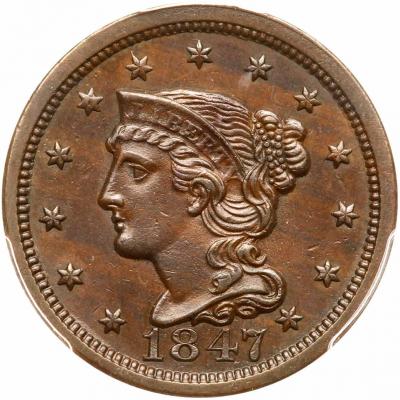 Lot 109 of 2145: 1847 N-12 R3+ Repunched 8 PCGS graded AU58, CAC Approved