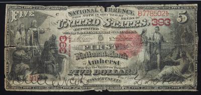 Lot 625 of 2575: $5 National Bank Note. First NB of Amherst, MA. Ch. 393. Fr. 401. PMG Very Good 10, tear