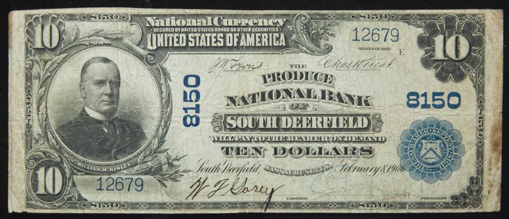Lot 687 of 2575: $10 National Bank Note. Produce NB, South Deerfield, MA. Ch. 8150. Fr. 625.
