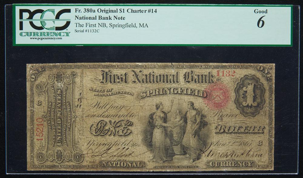 Lot 603 of 2575: $1 National Bank Note. First NB, Springfield, MA. Ch. 14. Fr. 380a. PCGS-C Good 6 Apparent.