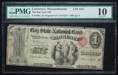 Lot 604 of 2575: $1 National Bank Note. Bay State NB, Lawrence, MA. Ch.1014. Fr. 380a. PMG Very Good 10, discoloration.