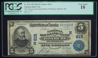 Lot 664 of 2575: $5 National Bank Note. National Rockland Bank of Roxbury, Boston, MA. Ch. 615. Fr. 590. PCGS-C Very Good 10.