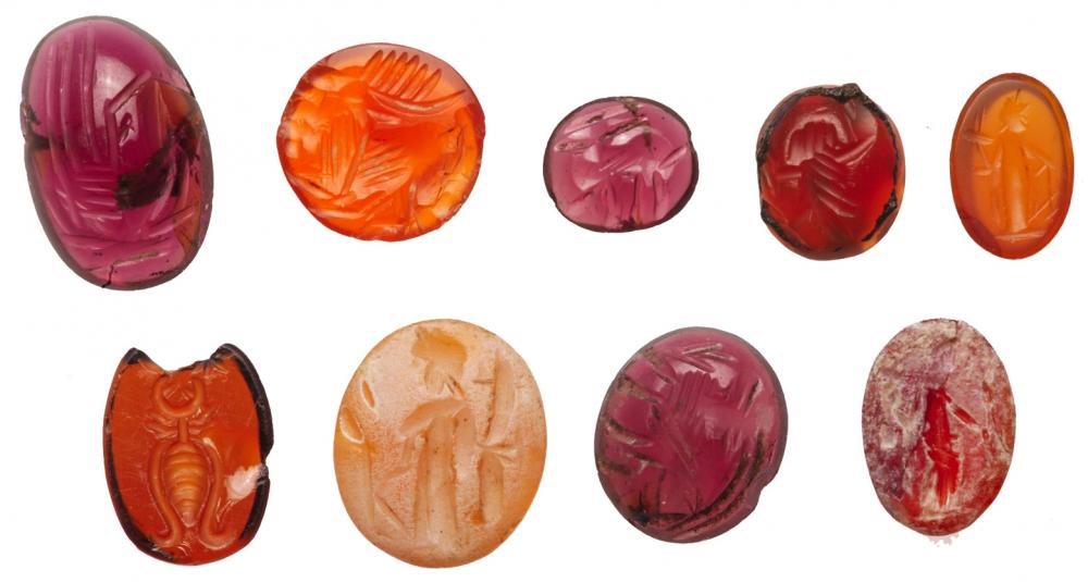 Lot 577 of 937: 9-Piece Lot of Late Roman and Sasanian Carnelian and Agate Small Gemstone Intaglio Seals